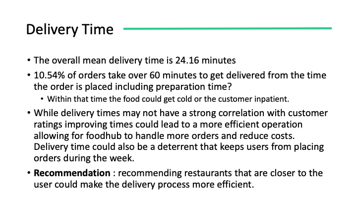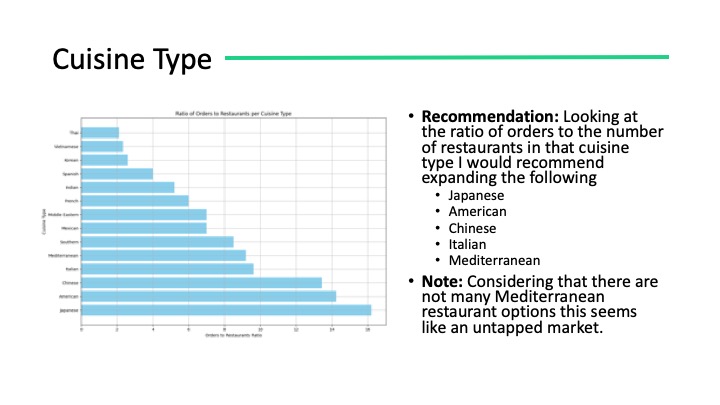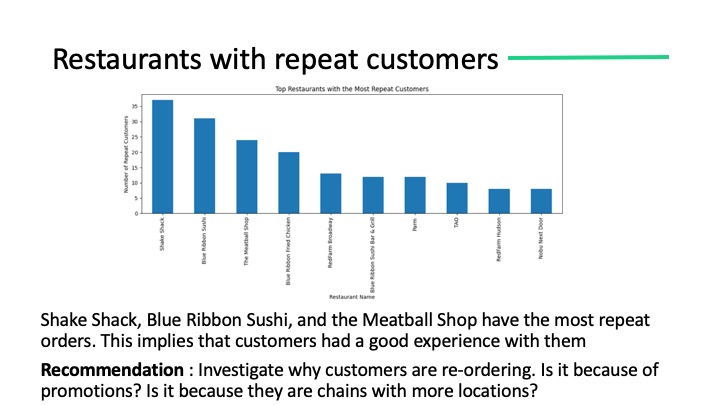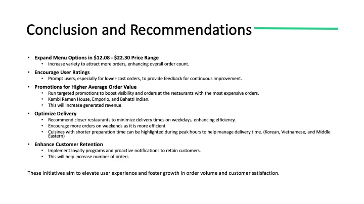 Given a dataset of a food delivery app I cleaned, and analyzed the data to assess demand trends. My goal was to make recommendations that would help enhance customer experience and improve operations. The analysis focused on answering key questions to support business growth.